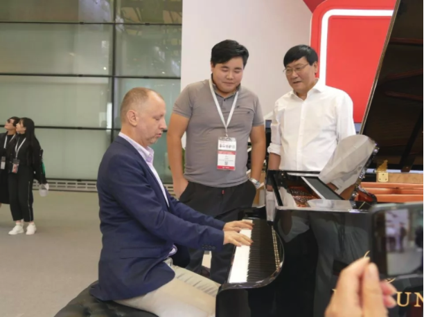 眾多來賓由海倫鋼琴董事長陳海倫與副總經(jīng)理陳斌卓親自接待,陳海倫董事長向來自國外的朋友詳細(xì)介紹了維也納高端精品系列鋼琴的技術(shù)工藝優(yōu)勢(shì),并且安排專業(yè)演奏者向大家展示了海倫鋼琴出色的音樂演奏性能。