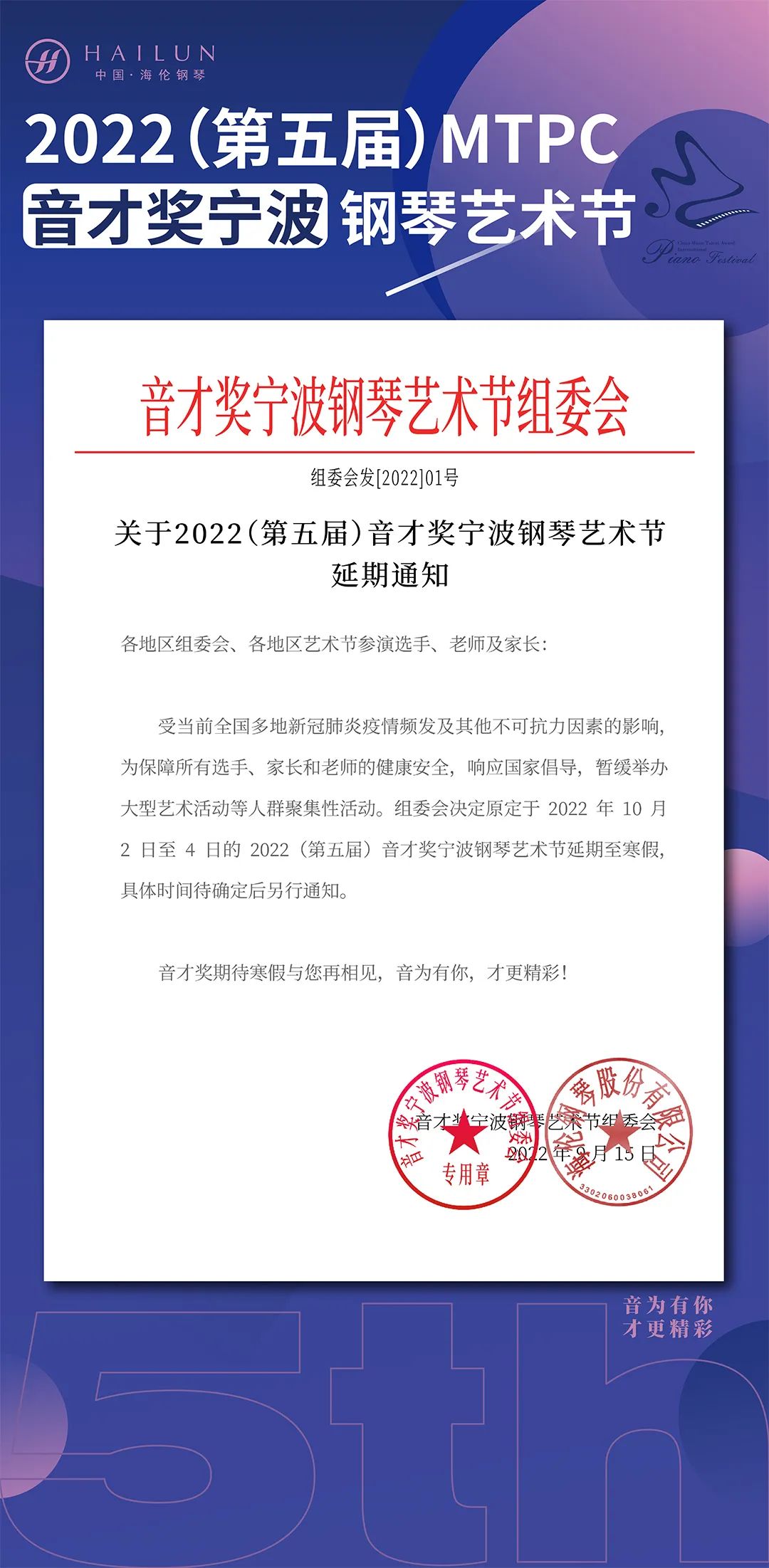 聚焦海倫丨關于2022(第五屆)MTPC音才獎寧波鋼琴藝術節延期通知