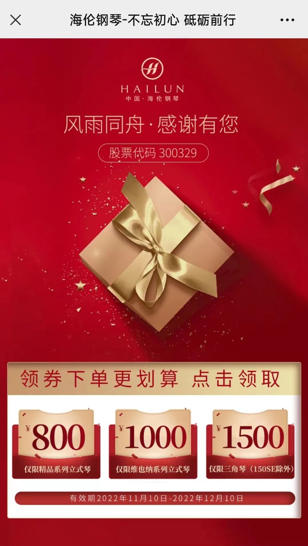 關(guān)注“海倫鋼琴”官方微信公眾號(hào),回復(fù)“上市十周年”,點(diǎn)擊領(lǐng)取福利進(jìn)入領(lǐng)券頁面;