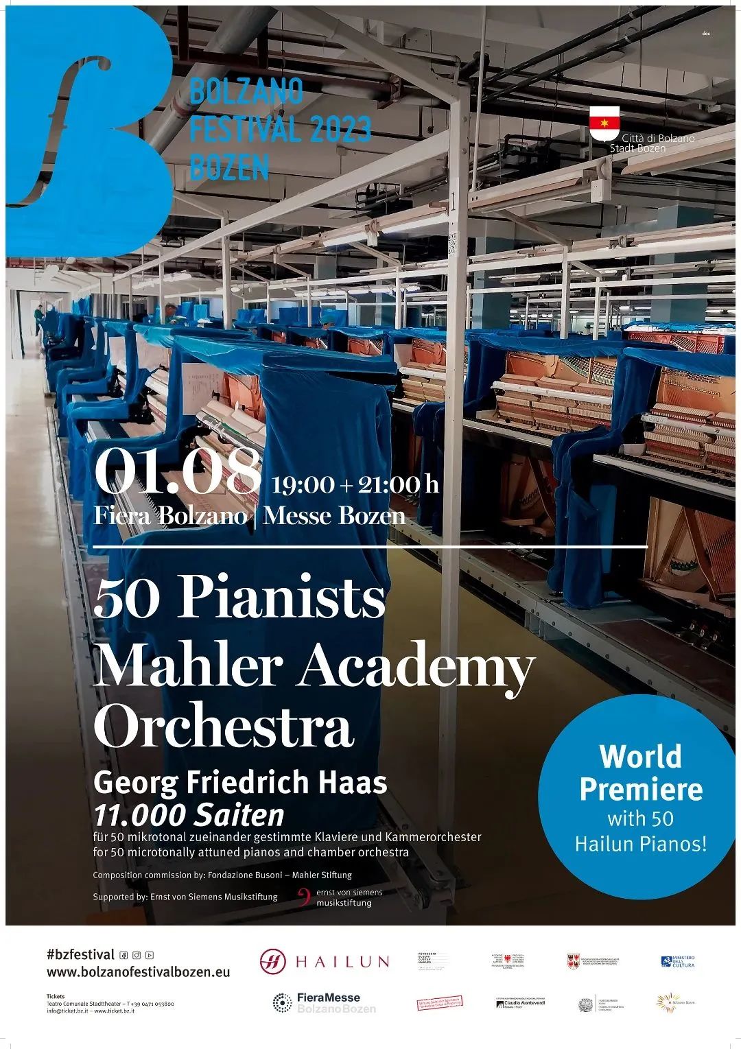 這是奧地利著名作曲家格奧爾格·弗里德里希·哈斯(Georg Friedrich Haas)受“費(fèi)魯奇奧·布索尼·古斯塔夫·馬勒基金會(huì)”委約而為室內(nèi)樂(lè)隊(duì)與50臺(tái)鋼琴而創(chuàng)作的《11,000根弦》的世界首演,在博爾扎諾音樂(lè)節(jié)上完美演出。